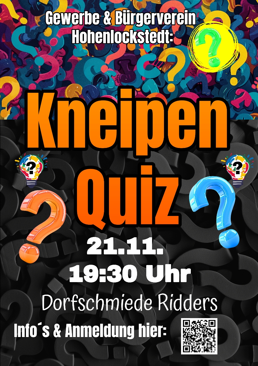 Am Freitag, den 21. November 2025, lädt der Gewerbe- und Bürgerverein Hohenlockstedt zu einem besonderen Abend in die Gaststätte „Zur Dorfschmiede“ ein: Unser erstes großes Kneipenquiz!